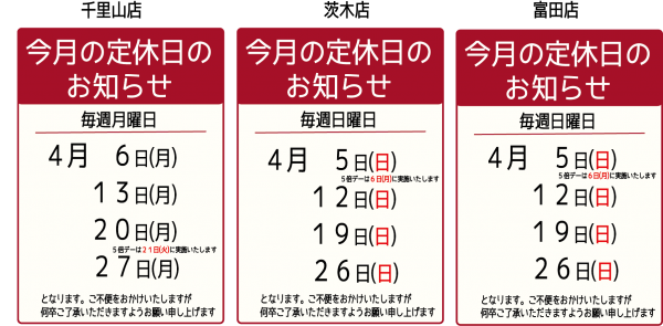 4月度店休日のお知らせ